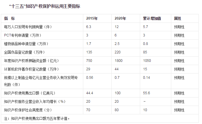 《规划》指出,要深入实施知识产权战略,深化知识产权领域改革,严格知识产权保护,加强知识产权运用,提升知识产权质量和效益,扩大知识产权国际影响力,加快建设中国特色、世界水平的知识产权强国。到2020年,知识产权重要领域和关键环节的改革取得决定性成果,建成一批知识产权强省、强市,知识产权保护环境显著优化,知识产权运用效益充分显现,知识产权综合能力大幅提升。每万人口发明专利拥有量从2015年的6.3件增加到12件,国际专利申请量从2015年的3万件增加到6万件,知识产权使用费出口额从2015年的44.4亿美元提高到100亿美元。