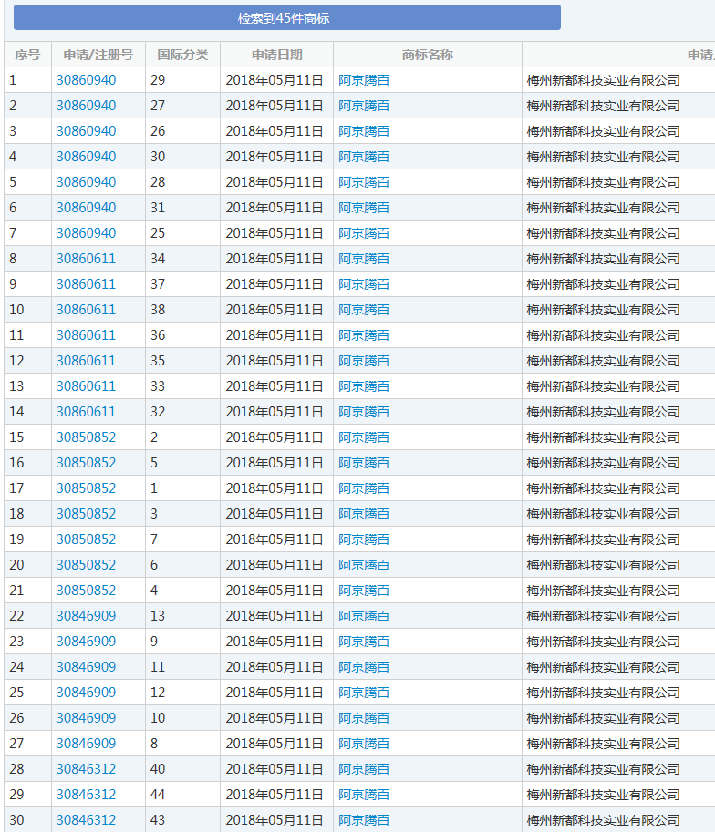 “阿京腾百”不是注册几个类别的,而是注册了全类商标,对,45个类别全面覆盖!