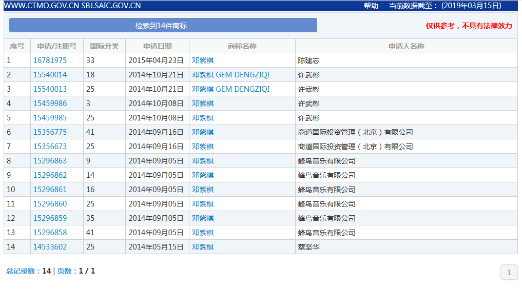 毫无疑问,邓紫棋是这家公司挖到过的最大一块“宝藏”。而早在2014年9月,蜂鸟音乐就已经将“邓紫棋”和“G.E.M”申请商标注册,领域涵盖文娱、珠宝、广告销售等。