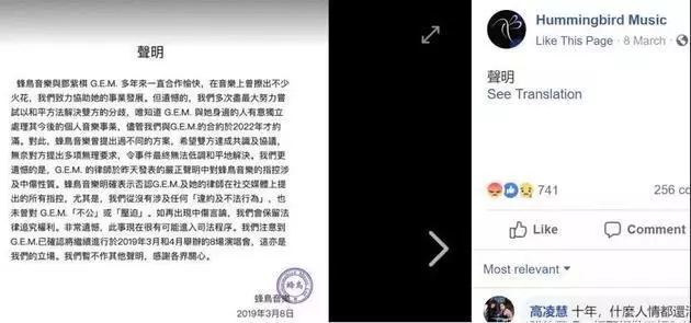 3月8日,蜂鸟音乐在官网以及社交平台发布声明回应,表示从未涉及任何“违约及不法行为”,也未对G.E.M(邓紫棋)有过“不公”或“压迫”。